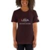 “USA – Snowboarding – on Chest.” Snowboard riders, snowboarding teams, declare your sport with style and USA pride. Quality, assertive colors, clean design, and amazing comfort make this CompetitionStyle™ t-shirt a winner. Soft, midweight, and flattering. Great for training, gym workout, or casual wear. Perfect snowboarding gift too. Unisex.